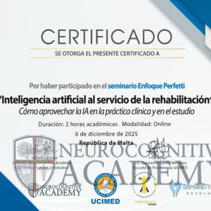Certificado de participación Seminario Enfoque Perfetti: Inteligencia artificial al servicio de la rehabilitación